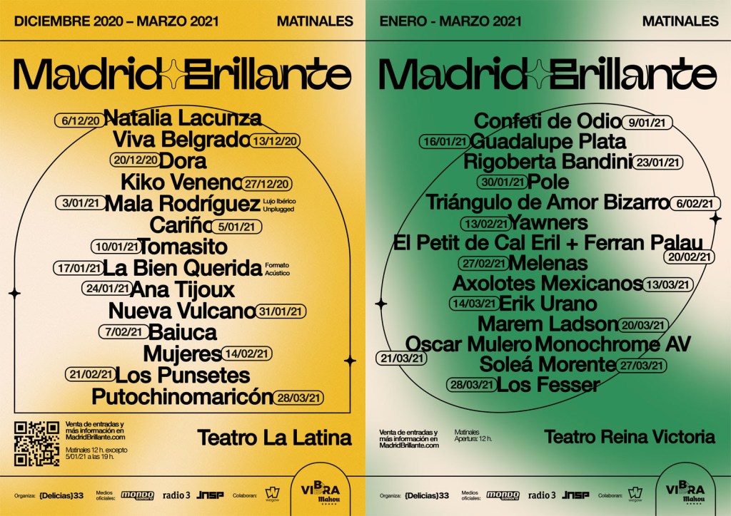 Madrid Brillante es un festival que se programará de diciembre de 2020 a marzo de 2021 un nuevo formato para nuevos tiempos : «Es obvio que hay que adaptarse a la nueva realidad. Lo que buscábamos era dinamizar la escena de conciertos de Madrid, sin querer quitarle el puesto a nadie. De ahí lo de hacer matinales y en teatros que normalmente no programan música. De todas maneras, estamos ya planeando nuevas cosas que van a ser muy chulas»-señala Nacho Ruiz.
